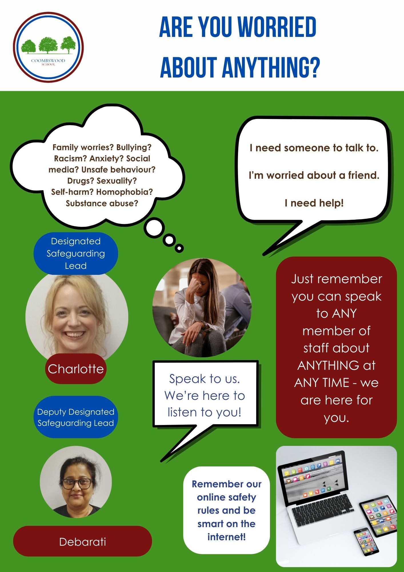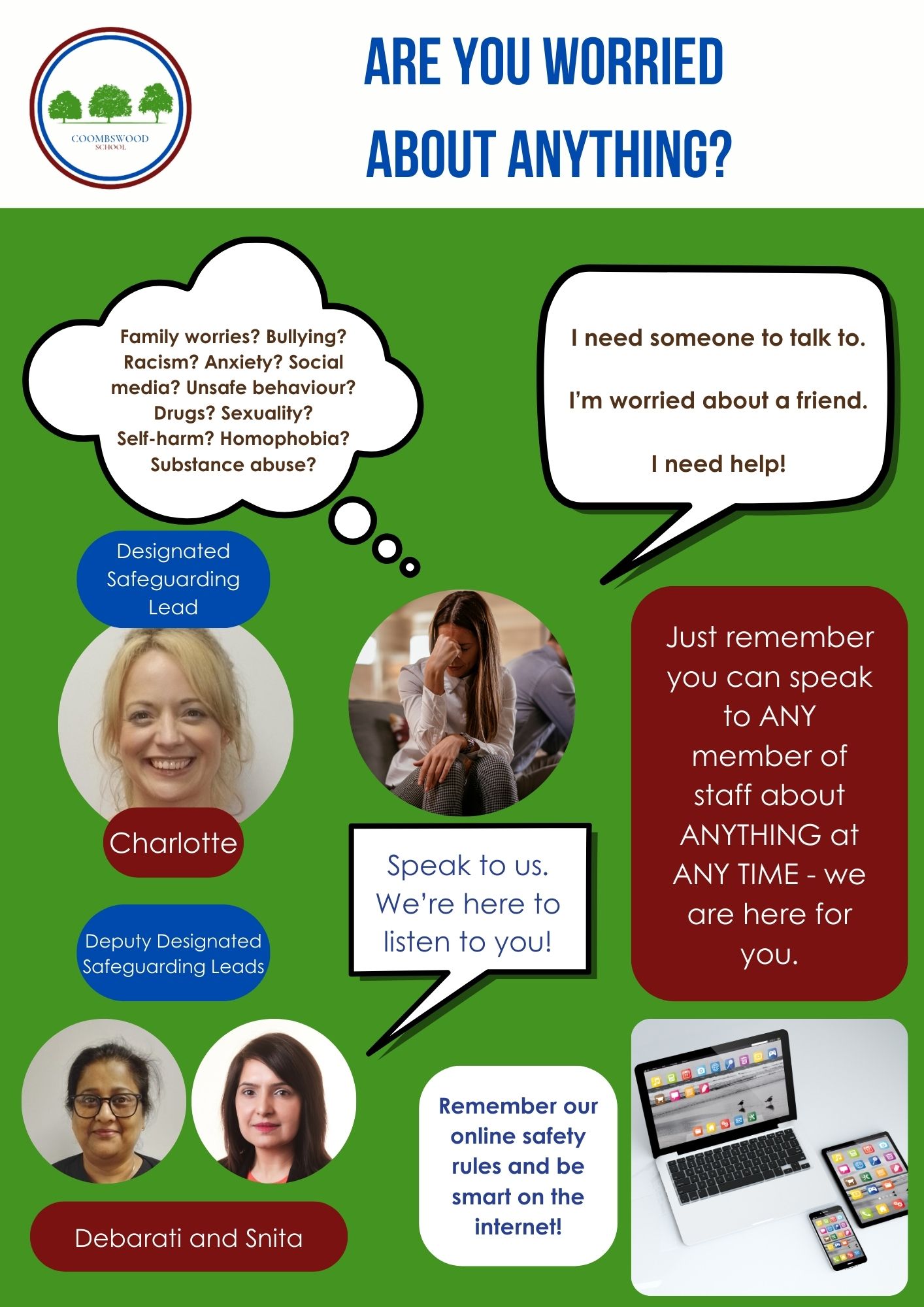 - You can talk to any adult in the school about anything. Do not keep your concerns to yourself; nothing is too small or too big.